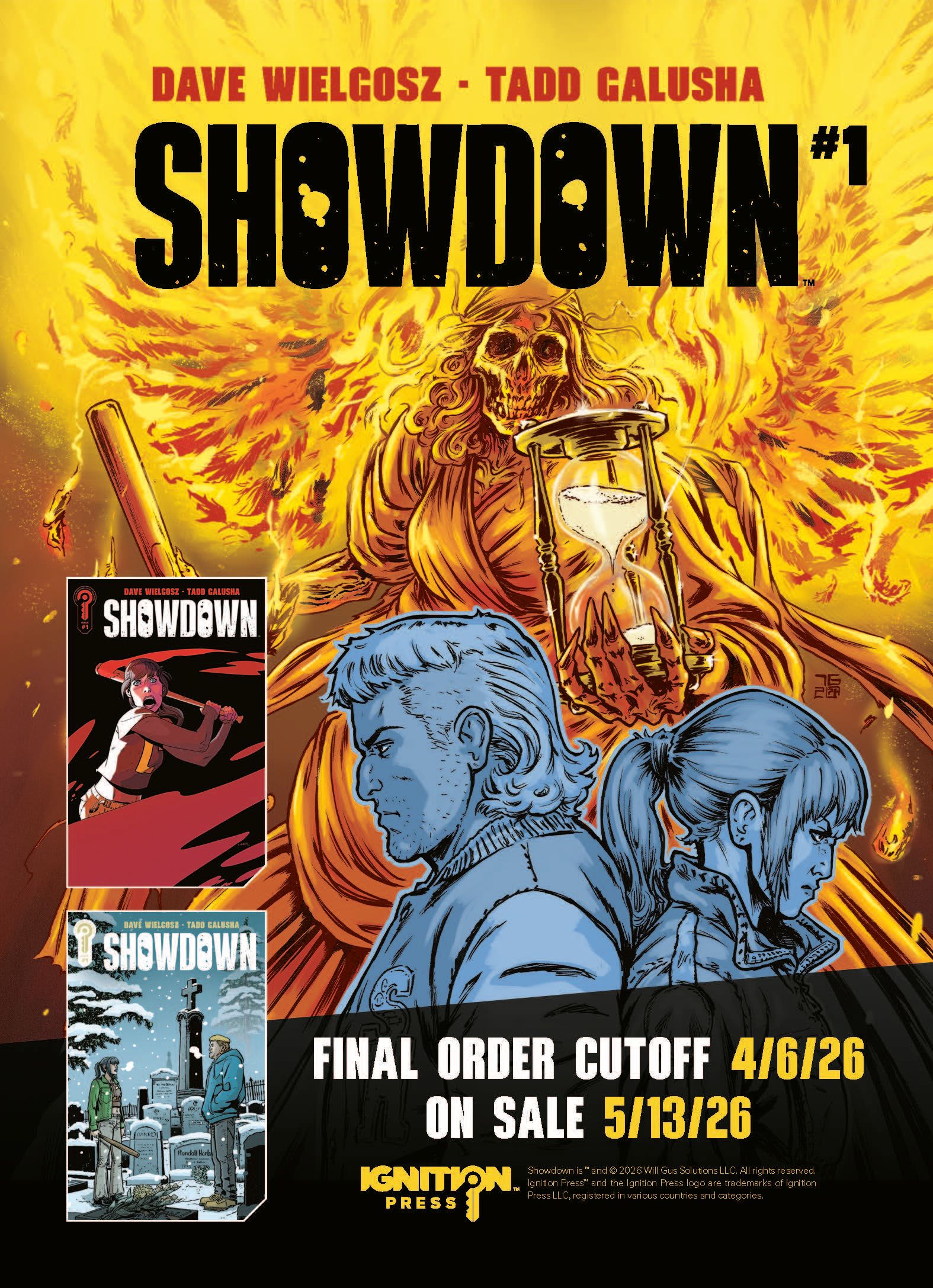 There is also going to be a Showdown Ashcan. For those who don’t know an ashcan is a smaller/preview version of a comic that comes out before the series launches. Ignition Press has been doing a number of Ashcans for their new series and they have been very successful. Our Ashcan comes out in stores on April 22nd, 2026 and will feature the first eleven (of twenty two) pages of the first issue, fully colored and lettered. How does your store get it?