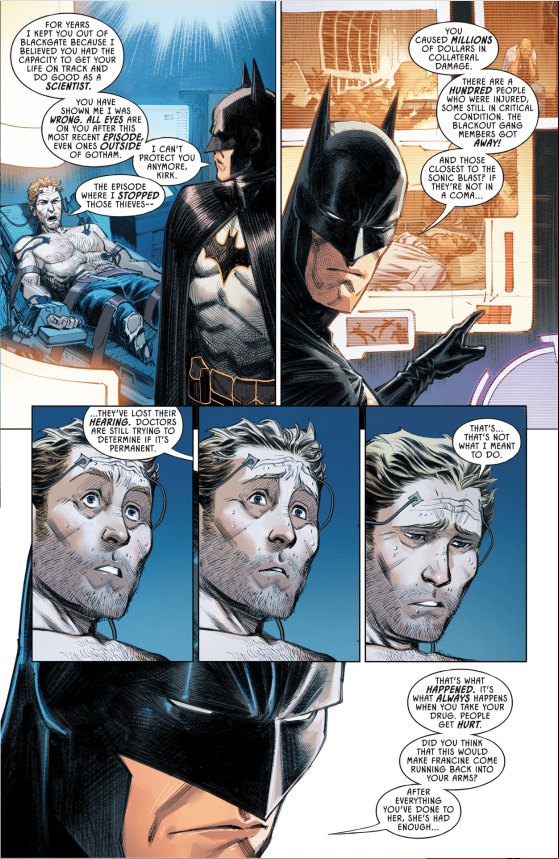 After a few days, Kirk Langstrom wakes up in one of Batman’s bunkers around Gotham City, tied down to a bed. Kirk demands to be released. Batman tells Kirk that’s not going to happen and goes on to tell Langstrom how disappointed he is. Batman has given Kirk so many chances to get his act together, but after this most recent event, there are no more chances. The chase to get the sonic cannon caused millions of dollars in damage. The sonic blast that Man-Bat caused destroyed city infrastructure and left many people in the area without their hearing. An irony that devastates Kirk into silence.