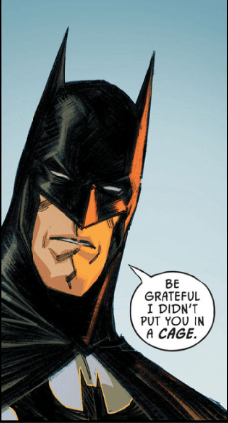 Not only is Kirk going to Blackgate Penitentiary for the damage he’s caused during this most recent Man-Bat attack, but Batman has run tests and the Man-Bat serum has done irreversible damage to Kirk’s cells. He is dying. Soon his human mind will shut down and all that will remain is a feral Man-Bat.