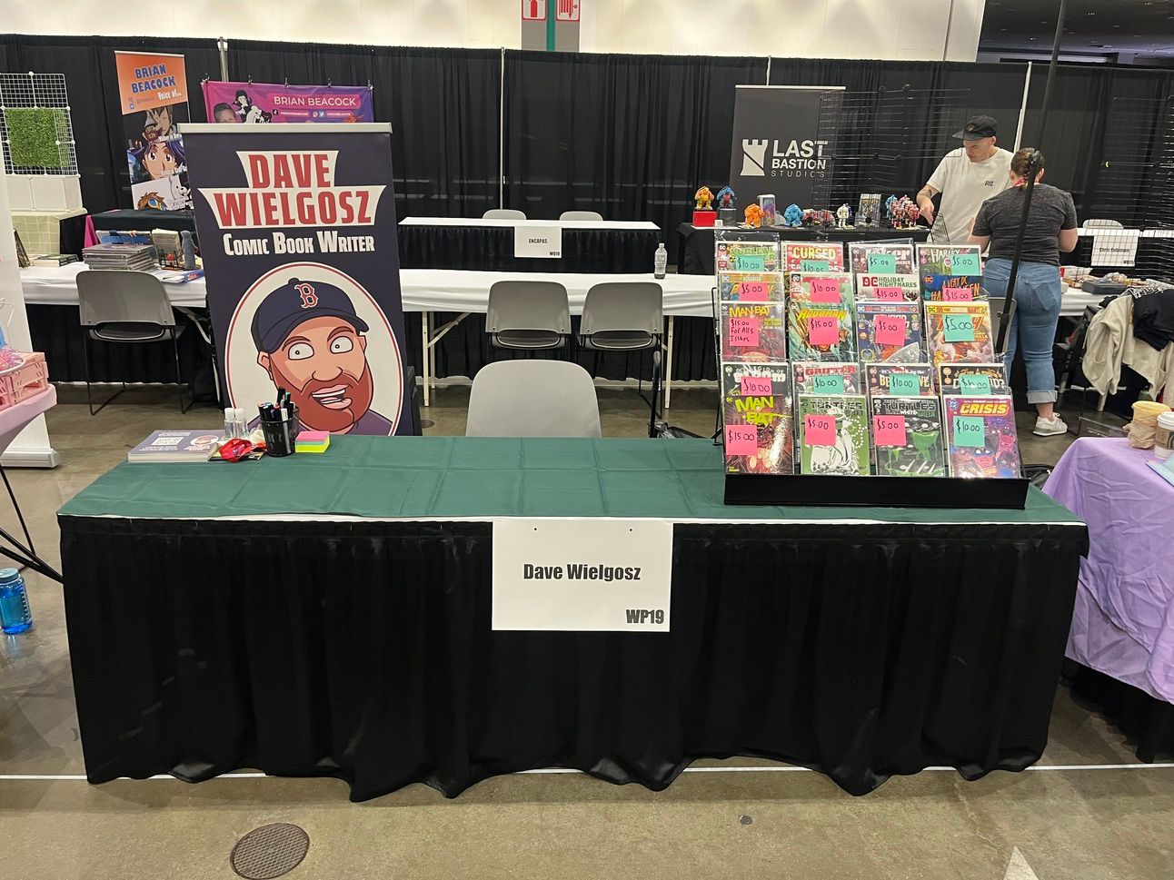 This is where I have to thank two very important people. First, my good friend and incredible comic book letterer, cartoonist, and designer Tom Napolitano. Tom and I were already doing something else, and when I got the table, I emailed him immediately and said, “Tom, I can’t go to the show without a banner. Would you be willing to put something together for me?” Tom didn’t hesitate, and the next day, I had something professional and charming to bring to the show that got me compliments. Including one mother and daughter duo who said, “We like that you are the same man from your banner.” Tom is the best; he’s someone I hope to always work with and be buddies with, and he came through for me in a big way.